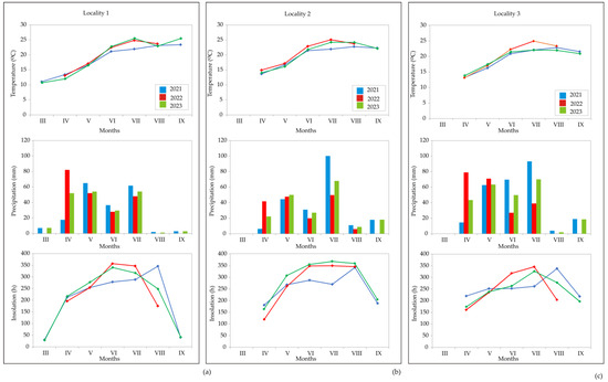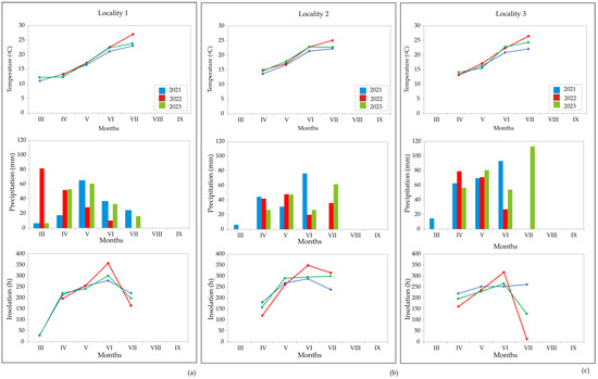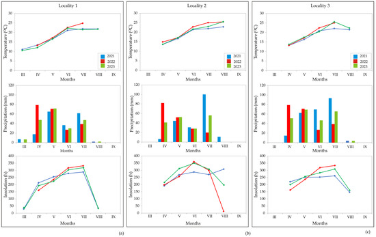 The weather conditions over the course of three consecutive growing periods for coriander cultivated at three locations in Serbia: (a) locality 1, (b) locality 2, and (c) locality 3.