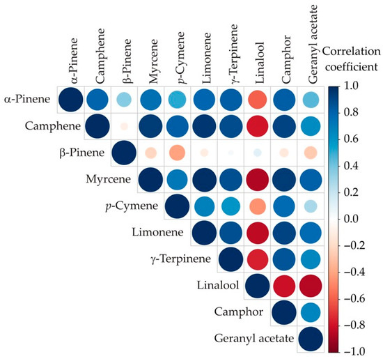 Taking into account that the main compound in coriander essential oil was linalool, from Figure 5 it can be noticed that it is negatively correlated with the rest of the observed compounds in coriander seeds. The highest negative correlations are between the contents of linalool and myrcene (r = −0.866), as well as the contents of linalool and limonene (r = −0.829). Furthermore, the content of linalool is negatively correlated with that of geranyl acetate and camphor (r = −0.859 and r = −0.809, respectively, statistically significant at the p < 0.001 level). On the other hand, the highest positive correlations are noticed between the contents of limonene and myrcene (r = 0.982), and myrcene and camphor (r = 0.949), which were statistically significant at the p = 0.001 level. The content of α-pinene is the most positively correlated with that of γ-terpinene (r = 0.828), camphor (r = 0.822), and camphene (r = 0.804), which were statistically significant at the p < 0.001 level. A high positive correlation is also observed between the contents of camphene and limonene, myrcene, and camphor (r = 0.953, r = 0.942, r = 0.915, respectively; p < 0.001).