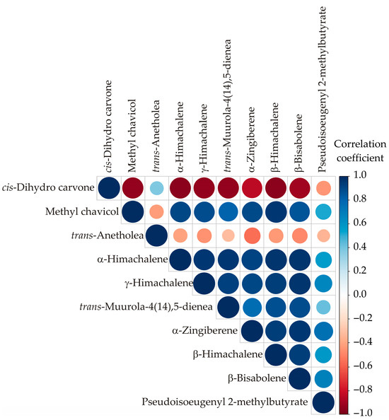 The highest negative correlations are between the contents of cis-dihydro carvone and β-himachalene (r = −0.956), α-himachalene (r = −0.955), methyl chavicol (r = −0.935), γ-himachalene (r = −0.933), trans-muurola-4(14),5-diene (r = −0.933), and β-bisabolene (r = −0.907), which were statistically significant at the p < 0.001 level. On the other hand, high positive correlations are observed between the content of methyl chavicol, which is positively correlated with that of β-himachalene and α-himachalene (r = 0.959 and r = 0.904, respectively), and were statistically significant at the p < 0.001 level. It can be also noticed that the content of α-himachalene is positively correlated with that of β-bisabolene (r = 0.969), β-himachalene (r = 0.966), γ-himachalene (r = 0.955), trans-muurola-4(14),5-diene (r = 0.951), and α-zingiberene (r = 0.918), which were statistically significant at the p < 0.001 level. Similarly, the content of γ-himachalene is positively correlated with that of β-bisabolene (r = 0.962), β-himachalene (r = 0.936), trans-muurola-4(14), 5-diene (r = 0.921), and α-zingiberene (r = 0.905), which were statistically significant at the p < 0.001 level. The content of α-zingiberene is positively correlated with the contents of β-bisabolene and β-himachalene (r = 0.956, r = 0.935, respectively), while the content of β-himachalene is positively correlated with that of β-bisabolene (r = 0.938, p < 0.001).