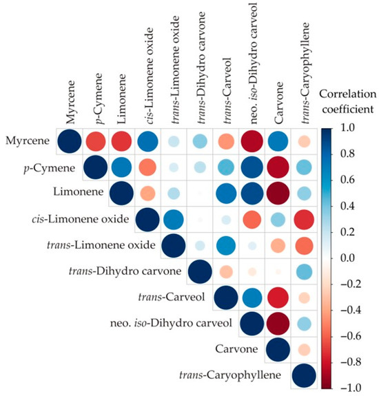 There is a negative correlation between the contents of myrcene and neo iso-dihydro carveol (r = −0.869; p < 0.001), limonene (r = −0.700; p < 0.001), and p-cymene (r = −0.669; p < 0.001), with that of cis-limonene oxide and carvone (r = 0.759 and r = 0.712, respectively, which were statistically significant at the p < 0.001 level). On the other hand, the content of p-cymene is the most positively correlated with that of neo iso-dihydro carveol (r = 0.869) and limonene (r = 0.722), and the most negatively correlated with that of carvone (r = −0.864), which were statistically significant at the p < 0.001 level. There is also a high positive correlation between the contents of limonene and neo iso-dihydro carveol and trans-carveol (r = 0.887 and r = 0.743, respectively, and statistically significant at p < 0.001), while a negative correlation exists between the contents of limonene and carvone (r = −0.941). Furthermore, the content of carvone is also negatively correlated with the contents of neo iso-dihydro carveol and trans-carveol (r = −0.935, r = −0.774, respectively; p < 0.001).