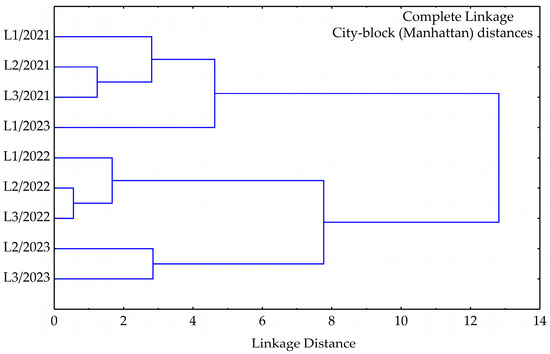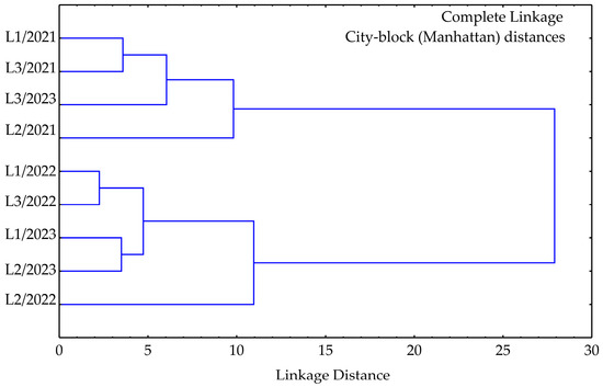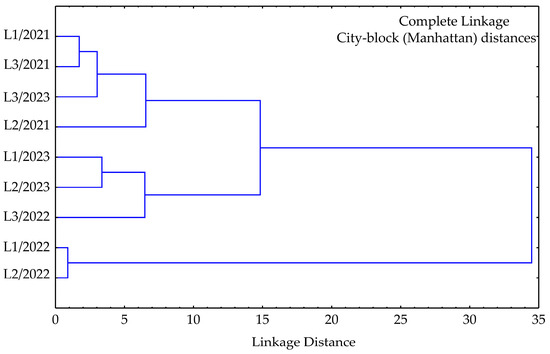 The dendrogram from the cluster analysis for the observed annual caraway samples, shown in Figure 10, revealed three primary clusters. The first cluster comprised samples L1/2021, L3/2021, L3/2023, and L2/2021. The second cluster encompassed samples L1/2023, L2/2023, and L3/2022. Lastly, the third cluster consisted solely of samples L1/2022 and L2/2022. Notably, the linkage distance between the main clusters, depicted on the abscissa axis, was approximately 35.