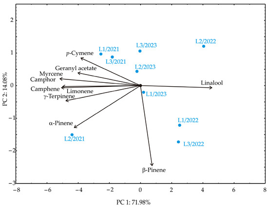 The PCA biplot diagram of the relationships among detected compounds in coriander samples; L1/2021—Location 1 for 2021, L1/2022—Location 1 for 2022, L1/2023—Location 1 for 2023, L2/2021—Location 2 for 2021, L2/2022—Location 2 for 2022, L2/2023—Location 2 for 2023, L3/2021—Location 3 for 2021, L3/2022—Location 3 for 2022, and L3/2021—Location 3 for 2023.