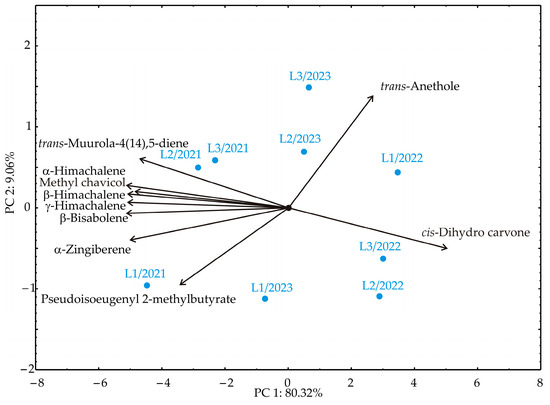 The PCA biplot diagram of the relationships among detected compounds in aniseed samples; L1/2021—Location 1 for 2021, L1/2022—Location 1 for 2022, L1/2023—Location 1 for 2023, L2/2021—Location 2 for 2021, L2/2022—Location 2 for 2022, L2/2023—Location 2 for 2023, L3/2021—Location 3 for 2021, L3/2022—Location 3 for 2022, and L3/2021—Location 3 for 2023.
