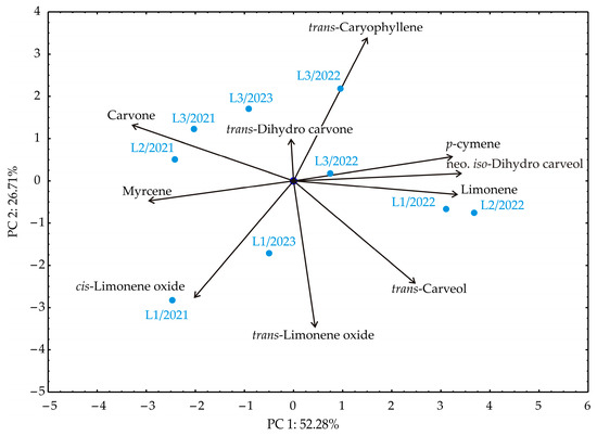 The PCA biplot diagram of the relationships among detected compounds in annual caraway samples; L1/2021—Location 1 for 2021, L1/2022—Location 1 for 2022, L1/2023—Location 1 for 2023, L2/2021—Location 2 for 2021, L2/2022—Location 2 for 2022, L2/2023—Location 2 for 2023, L3/2021—Location 3 for 2021, L3/2022—Location 3 for 2022, and L3/2021—Location 3 for 2023.