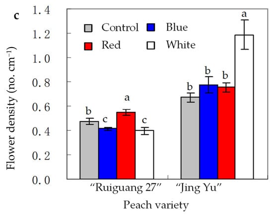 An example of the application of supplemental lighting with colored fluorescent light to greenhouse peach production in China [89]. (a) Plants from blue light treatment during fruit growth period; (b) Plants from blue light treatment during flowering period; (c) Flower density under supplement lighting with blue, red or white light, and no lighting as control. Flower density = flower number on one-year stem/length of one-year stem.