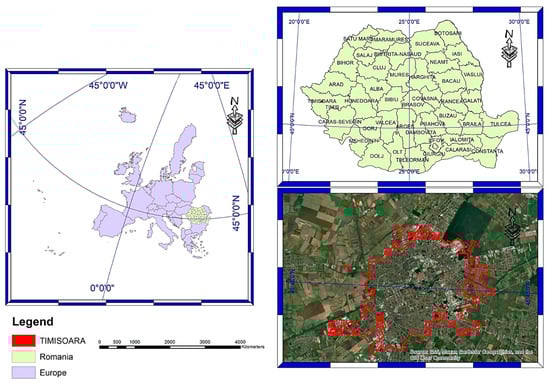 Timișoara is located in the Western Romanian Plains, Timiș County (45.75372° N; 21.22571° E), being the core of one of the most significant metropolitan areas in the country (Figure 1). It has a surface of 6870.24 ha, of which 362.36 ha are green spaces []. The number of citizens is 250.849 [], so there are 14.44 sqm of green spaces/inhabitant, below the World Health Organization (WHO) recommendation of 50 sqm/inhabitant [].