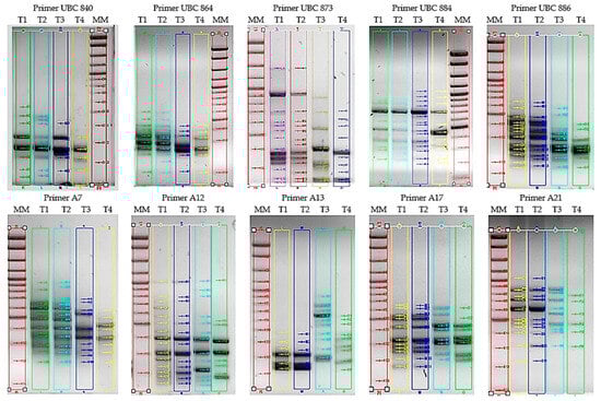 A17 and UBC864 showed a polymorphism percentage of 61.54% and 71.43%, respectively (Table 3 and Figure 2).