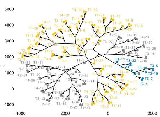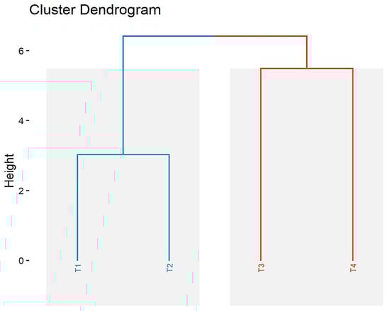 Cluster analysis of Tilia spp. populations T. cordata I (T1), T. cordata II (T2), T. platyphyllos (T3), and T. argentea (T4).