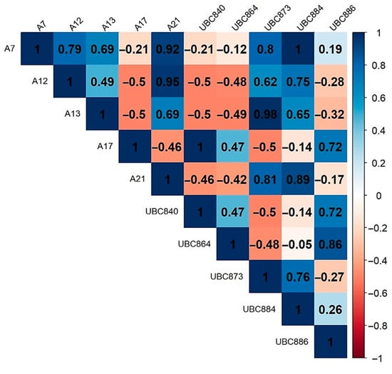 To optimize a 50% more economically efficient method for analyzing larger populations, we investigated the correlations between ISSR markers in the context of the genetic structure of studied populations. In this respect, only the primers that covered all significant negative correlations were selected: UBC840, UBC864, UBC873, UBC886, and A17.