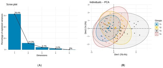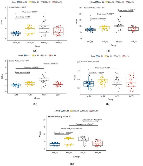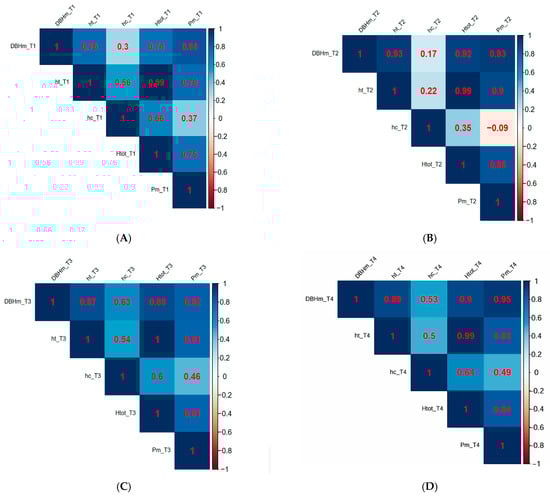 All analyses were performed using R Statistical Software (v4.3.3; R Core Team 2023) []. Non-parametric Kruskal–Wallis tests were employed to assess significant differences in mean values of dendrometric indices (medium diameter at breast height (DBHm), total tree height (Htot), trunk height (ht), crown height (hc), and medium crown spread (Pm)) across populations (T1, T2, T3, and T4). Dunn’s post-hoc test was used for pairwise comparisons in cases where the Kruskal–Wallis test indicated significant overall differences. Linear relationships between dendrometric indices were evaluated using Pearson’s correlation coefficients. Simple linear regression models were further developed to quantify these relationships. To explore the underlying structure within the dendro-metric data of 120 trees, principal component analysis (PCA) was conducted based on a correlation matrix. This technique reduces data dimensionality by identifying a smaller set of uncorrelated principal components that capture the majority of the variance in the original data. Subsequently, cluster analysis was performed on the derived principal components to group trees with similar dendrometric characteristics.