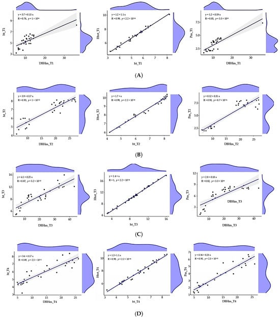 Linear relationships between dendrometric measurements of trees showed that (i) the larger medium diameter of the trunk at breast height (DBHm1–DBHm120) is, the greater the medium trunk height (ht1–ht120) is; (ii) the medium trunk height (ht1–ht120) is, the higher the medium total tree height (Htot1–Htot120) is; and (iii) the larger medium diameter of the trunk at breast height (DBHm) is, the larger the medium crown spread (Pm) is for all 120 analyzed trees.