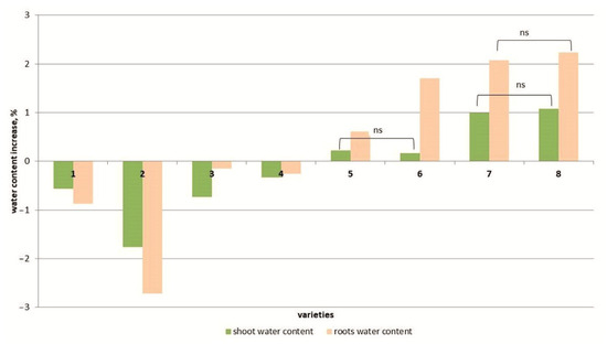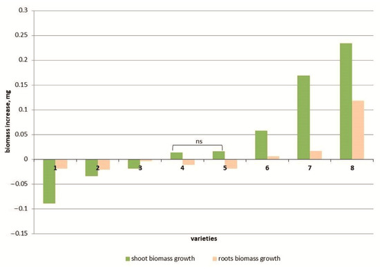 Shoot and root weight increase in 8 tomato varieties: cv. Belyij Naliv—1, cv. Geya—2, line YaLF—3, cv. Paradigma—4, cv. Recordsmen—5, cv. Yurevskij—6, cv. Bych’e Serdce—7, cv. Astrakhanskij—8. The overall difference was significant according to Kruskal–Wallis test (p < 0.01). All pairwise differences were significant as well, except those designated in the plot as “ns” (not significant).