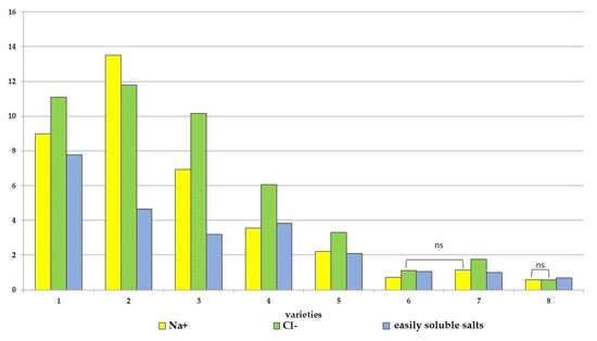 Accumulation of easily soluble salts, sodium ions and chlorine in the plant tissues of various tomato genotypes, differing in salt tolerance. cv. Belyij Naliv—1, cv. Geya—2, cv. Recordsmen—3, cv. Paradigma—4, line YaLF—5, cv. Yur’evskij—6, cv. Bych’e Serdce—7, cv. Astrahanskij—8. The overall difference was significant according to Kruskal–Wallis test (p < 0.01). All pairwise differences were significant as well, except those designated in the plot as “ns” (not significant). The accumulation of readily soluble salts was calculated as N/100 and measured in mkSm. Ion accumulation was measured in mg g−1.