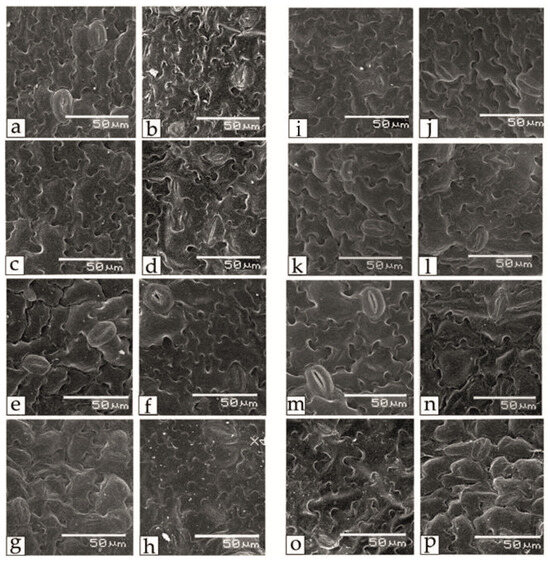 The effect of salinity on the stomata area at 0 mM NaCl (a,c,e,g,i,k,m,o) and 150 mM NaCl (b,d,f,h,j,l,n,p) in lower epidermal leaf tissue of various tomato genotypes that differ in salt tolerance. (a,b)—cv. Astrahanskij; (c,d)—cv. Bych’e Serdce; (e,f)—cv. Geya; (g,h)—cv. Paradigma; (i,j)—cv. Recordsmen; (k,l)—line YaLF; (m,n)—cv. Belyij Naliv; (o,p)—cv. Yur’evskij.