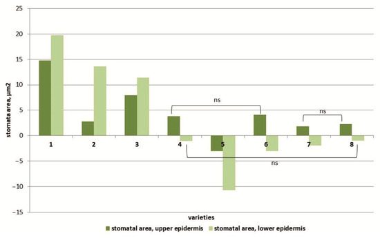 The effect of salinity on the stomata area in the upper epidermal leaf tissues and in the lower epidermal leaf tissues of various tomato genotypes that differ in salt tolerance. Legend: cv. Belyij Naliv—1, cv. Geya—2, cv. Recordsmen—3, cv. Paradigma—4, line YaLF—5, cv. Yur’evskij—6, cv. Bych’e Serdce—7, cv. Astrahanskij—8. The overall difference was significant according to Kruskal–Wallis test (p < 0.01). All pairwise differences were significant as well, except those designated in the plot as “ns” (not significant).