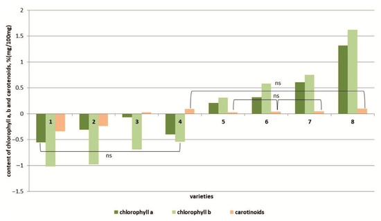 Content of chlorophyll a, b and carotenoids in tomato genotypes differing in salt tolerance under salinity conditions. Legend: cv. Belyij Naliv—1, cv. Geya—2, cv. Recordsmen—3, cv. Paradigma—4, line YaLF—5, cv. Yur’evskij—6, cv. Bych’e Serdce—7, cv. Astrahanskij—8. The overall difference was significant according to Kruskal–Wallis test (p < 0.01). All pairwise differences were significant as well, except those designated in the plot as “ns” (not significant).