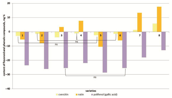 Content of flavonoid and phenolic compounds (quercetin, rutin, polifenol (gallic acid)) in tomato genotypes differing in salt tolerance under 150 mM NaCl. Legend: cv. Belyij Naliv—1, cv. Geya—2, cv. Recordsmen—3, cv. Paradigma—4, line YaLF—5, cv. Yur’evskij—6, cv. Bych’e Serdce—7, cv. Astrahanskij—8. The overall difference was significant according to Kruskal–Wallis test (p < 0.01). All pairwise differences were significant as well, except those designated in the plot as “ns” (not significant).