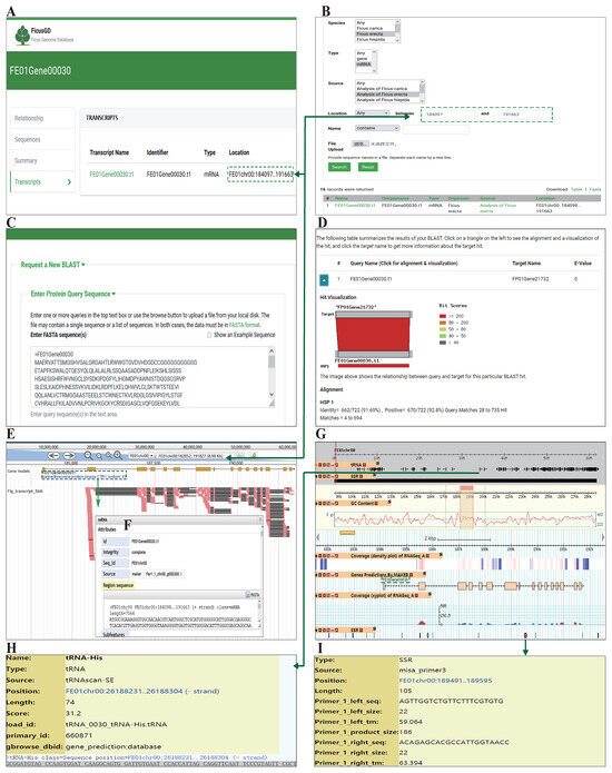 Search, JBrowse, and GBrowse browser functions of the FGD database website. (A) Gene page for FE01Gene00030, displaying gene details and chromosomal location information. (B) Ability to perform batch searches for multiple genes based on their location using Sequence Search feature. (C) Use of FGD Blast+ tool for cross-species BLAST searches using sequence information of FE01Gene00030. (D) Identification of protein sequences homologous to FE01Gene00030 in Ficus pumila. (E) Exploration of gene structure and BAM expression data for FE01Gene00030 using JBrowse browser, based on location information. (F) Access to detailed gene sequence information, including UTR and CDS regions. (G) Discovery of SSRs and tRNA in vicinity of the gene using GBrowse browser. (H) Detailed information on tRNA. (I) Detailed information on SSR.