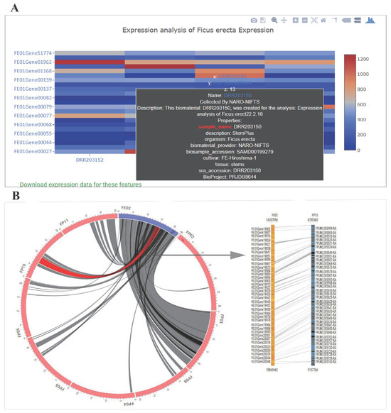 The FGD goes beyond merely housing RNA-seq data and gene expression datasets; it introduces the “Tripal Expression” module, crafted to facilitate the analysis of RNA-seq data, including pinpointing gene expression trends. This module offers a downloadable file feature, encompassing a comprehensive list of identified genes along with their pertinent details. For individual gene expression profiles, users can turn to the gene signature page. Moreover, the “Tripal Expression” module enhances user engagement through an interactive visualization tool. It employs a heatmap tool powered by Plotly’s JavaScript library (https://plot.ly, accessed on 23 September 2023), designed to graphically represent the expression profiles of a selected gene group (Figure 3A) [39]. All expression data, quantified by FPKM values, are pre-imported into the Chado database. The Plotly library leverages JavaScript to create interactive and dynamic charts and graphs, which can be integrated into web pages.