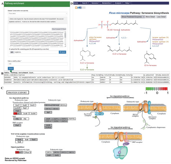 An analysis module of Pathway Enrichment and the biochemical pathway module in FGD database. (A) After selecting the background genome, users can input the sequence name to be analyzed in the text input box (or upload the file), set the p-value parameter, and then submit. (B) Enrichment analysis results were obtained (table on webpage). (C) ko03060 KEGG pathway diagram was rendered by the Pathview package inherited in the “Pathway Enrichment” module of FGD. (D) A metabolic pathway map for linalool synthesis in the PGDB metabolic pathway database.