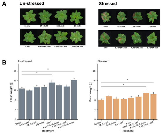 Picture of unstressed and water-deficit stressed napa cabbage plants (A) and shoot fresh weights (B). The plants were treated with KJ40 and various concentrations (0, 0.1, 0.5, 1 mM) of salicylic acid as well as in combination treatments under unstressed (left column) and water-deficit stressed (right column) conditions. Asterisks indicate statistical differences between treatments using t-test (*, p < 0.05; **, p < 0.01).