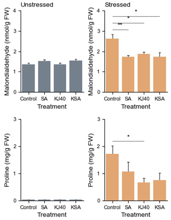 Malondialdehyde and proline contents of cabbage plants treated with single KJ40 and SA, and combination treatment (KSA) under unstressed condition (left column) and water-deficit stress (right column). Asterisks indicate statistical difference between treatments by t-test (*, p < 0.05; **, p < 0.01).