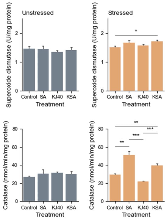 Antioxidant enzyme activity, including superoxide dismutase and catalase, of cabbage plants treated with single KJ40 and SA, and KSA combination under unstressed condition (left column) and water-deficit stress (right column). Asterisks indicate statistical differences between treatments using t-test (*, p < 0.05; **, p < 0.01; ***, p < 0.001).