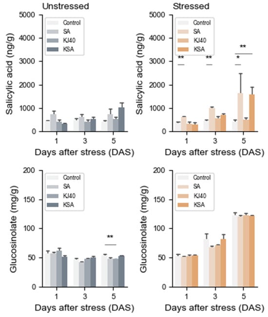 Salicylic acid and glucosinolate contents of cabbage plants treated with single KJ40 and SA, and KSA combination under unstressed condition (left column) or water-deficit stress (right column). Asterisks indicate statistical differences between treatments using t-test (*, p < 0.05; **, p < 0.01).