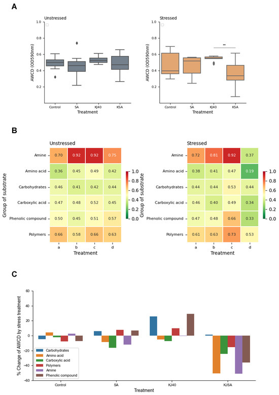 The average well color development (AWCD) index of soil samples at 72 h after incubation (A); heatmap of substrate average well color development (SAWCD) related to carbohydrates, amino acids, carboxylic acids, polymers, amines, and phenolic compounds (B) in rhizosphere soils treated with control (a), SA (b), KJ40 (c), and KSA (d); % changes of AWCD by stress treatment at 72 h after incubation (C). Asterisks indicate statistical differences between treatments using t-test (**, p < 0.01).