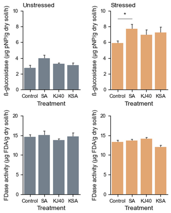 Soil enzyme activity, including beta-glucosidase, and FDase assay of napa cabbage plants treated with single KJ40 and SA, and KSA combination under unstressed condition (left column) or water-deficit stress (right column). An asterisk indicates statistical differences between treatments using t-test (*, p < 0.05).