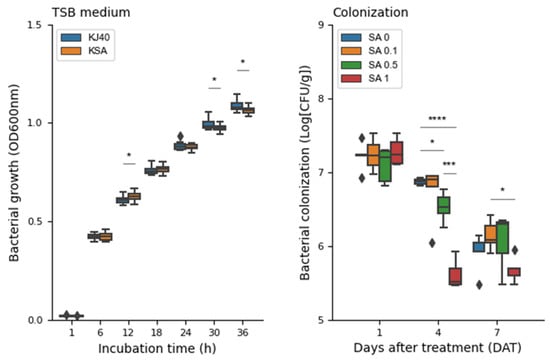 Population of KJ40 in tryptic soy broth with and without 0.5 mM of salicylic acid (left), and colonization at 1, 4, and 7 days after treatment (DAT). Asterisks indicate statistical differences between treatments using t-test (*, p < 0.05; ***, p < 0.001, ****, p < 0.0001).