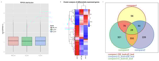 To understand the differences in gene expression during dormancy, it is necessary to identify DEGs between different stages. As shown in Figure 3A, the RPKM distribution of all genes was used to compare the gene expression levels in different groups. Among them, the raw reads of DB_bud, D_bud, and G_bud were 15,649,422, 17,329,672, and 15,162,263, respectively. Clean reads were 15,500,247, 17,151,297, and 15,162,263, accounting for 99.05%, 98.97%, and 99.02% of the total read segment data, respectively (Supplementary Table S1). Furthermore, the results indicated that there were 224 DEGs in D_bud vs. DB_bud, with 112 upregulated and 11 downregulated. Furthermore, a total of 975 DEGs were identified in D_bud vs. G_bud, of which 672 were upregulated and 303 were downregulated. A total of 868 DEGs were found in DB_bud vs. G_bud, of which 590 were upregulated and 278 were downregulated. Furthermore, the accumulation pattern of DEGs among different stages was visualized through a heatmap hierarchical cluster analysis (Figure 3B). Through the Venn plot (Figure 3C), it was found that there were 28 common differentially expressed genes among the three stages.