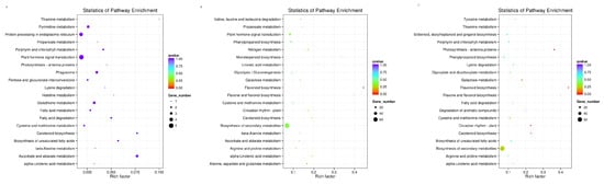 KEGG enrichment analysis of Pyrus pyrifolia ‘Huanghua’. (A) DB_bud vs. D_bud; (B) G_bud vs. D_bud; (C) G_bud vs. DB_bud.