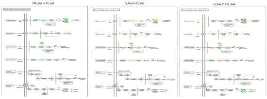 We further analyzed the functional involvement of the DEGs in different pathways by mapping them to the KEGG database. In Figure 4, the results showed that ‘Plant hormone signal transduction’ and ‘Protein processing in endoplasmic reticulum’ pathways were significantly enriched in DB_bud vs. D_bud. Meanwhile, the biosynthesis of secondary metabolites, plant hormone signal transduction, and flavonoid biosynthesis pathways were highly enriched in the G_bud vs. D_bud comparison. The biosynthesis of secondary metabolites, carotenoid biosynthesis, and galactose metabolism pathways were dominant in the G_bud vs. DB_bud comparison. Based on the KEGG database, the ‘Plant hormone signal transduction’ pathway was further mapped to analyze the hormone signaling pathway differential genes (Figure 5).