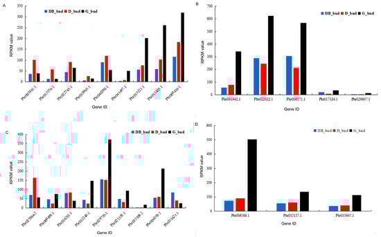By analyzing the plant hormone signaling pathways during the dormancy process of Pyrus pyrifolia ‘Huanghua’ flower buds, DEGs related to hormone metabolism were identified. In Figure 6, the expression levels of the genes Pbr009498.1 (LAX1), Pbr012348.1 (LAX1), Pbr021158.1 (GH35), and Pbr031621.1 (LAX2) encoding IAA were significantly higher in the endodormancy release initiation period (DB_bud) than the endodormancy period (D_bud). The expression level of Pbr025864.2 (IAA13) in the endodormancy period (D_bud) was significantly higher than the endodormancy release initiation (DB_bud) and the ecodormancy period (G_bud). The Pbr041942.1 (GID1B) gene also showed a significant increase during ecodormancy (G_bud), indicating that the expression of the GID1B gene is related to environmental conditions and promotes the progress of ecological dormancy. According to the RPKM values, there was a significant difference in the expression of genes PP2C24 (Pbr003841.1, Pbr018965.1) and PP2C08 (Pbr013576.1, Pbr022745.1) between the endodormancy initiation release and the endodormancy release period. These results indicated that the expression of the PP2C08 and PP2C24 genes encoding protein phosphatase has a significant impact on endodormancy release.
