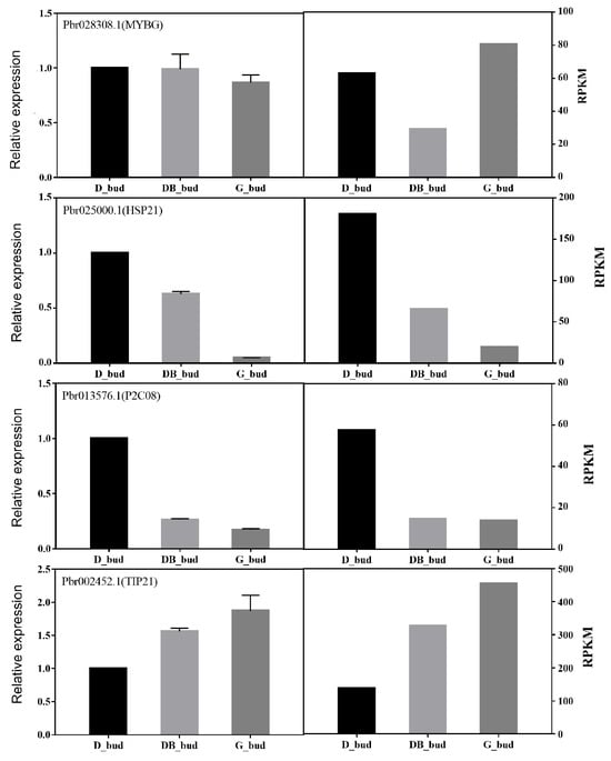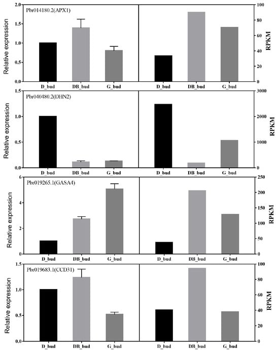 In Figure 7 and Figure 8, a total of 8 DEGs, including MYBG, HSP21, P2C08, TIP21, APX1, DHN2, GASA4, and CCD31, were analyzed using real-time PCR. The results showed that the qPCR data and RNA seq data of 8 DEGs showed similar trends of change. Among the 8 DEGs, the expression levels of APX1 and CCD31 were significantly higher in the DB_bud than in the D_bud and G_bud. The expression levels of GASA4 and TIP21 were significantly higher in the G_bud than in the D_bud and DB_bud.