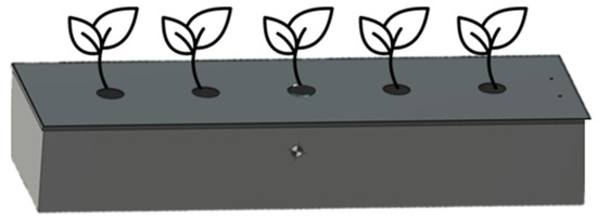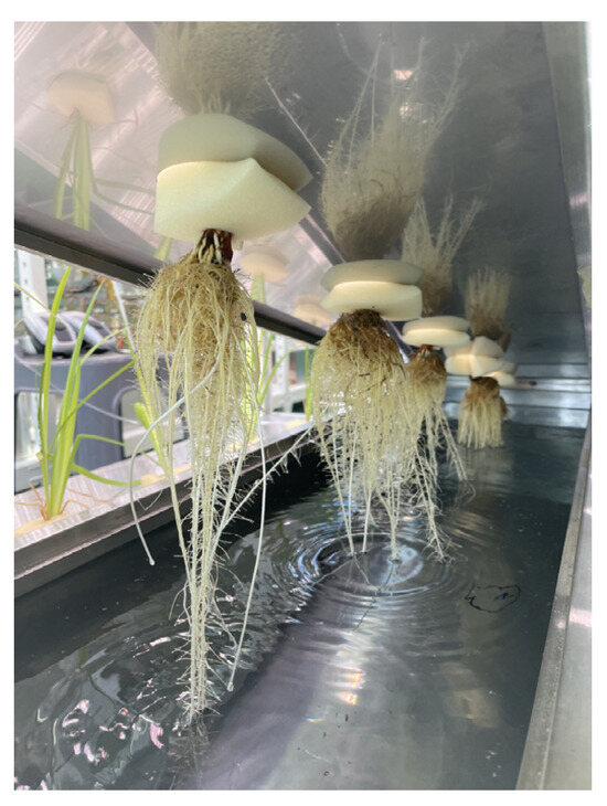 The containers for the experiments were made of stainless steel to minimize the impact of plastic, and the dimensions were 1.2 m × 0.2 m × 0.3 m for width, length, and height, respectively. To float the plants in the containers, lids were made with sizes of 0.15 m × 1.25 m. Five holes with diameters of 0.6 m were drilled at 0.15 m intervals, taking into account the plant spacing (Figure 2). To confirm the effectiveness of removing floating microplastics using plant roots, each plant was floated in a cultivation box and fixed with a sponge inserted into the cover hole of the cultivation box (Figure 3). The planting beds were 1.5 m × 0.9 m × 3.0 m (W × D × H, respectively), and they were set up in two rows, with Iris pseudacorus on the right and Lythrum anceps on the left (Figure 4).