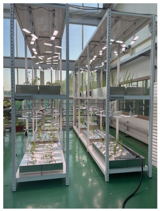 In April 2023, 60 unblooming Iris pseudacorus and Lythrum anceps in 2-inch plastic pots were purchased from a cultivation farm. The first acclimatization process was conducted in a greenhouse cultivation room for 14 days to reduce growth disorders due to environmental changes. After the first purification process, the soil attached to the roots was lightly shaken off and then completely removed by rinsing with tap water, and the plants were then immersed in tap water for 14 days to perform the second purification in a hydroponic form.