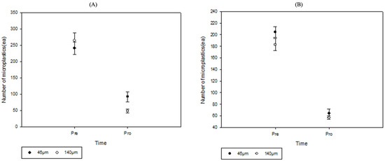 The microplastic removal rate for the plots planted with Iris pseudacorus decreased by 79.7%, from 241 ea to 92 ea, for the 46 µm microplastic particle size, and it decreased by 81.5%, from 265 ea to 49 ea, for the 140 µm microplastic particle size (Figure 6). The microplastic removal rate for the Lythrum anceps planted plots decreased by 68.7%, from 204 ea to 64 ea, for the microplastic particle size of 46 µm, and it decreased by 68.7%, from 183 ea to 57 ea, for the microplastic particle size of 140 µm (Figure 6).