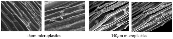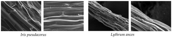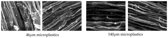 To identify the adsorbed microplastic particles from the plant roots, some roots from Iris pseudacorus and Lythrum anceps were removed and analyzed using a JEOL scanning electron microscope (JSM-6510). Microplastic adsorption analysis of the roots was performed once post-mortem (at 90 days). Root samples were examined for each plant as follows: 3 roots from the plants in the control group, 3 roots from the plants treated with microplastic particles sized 46 µm, and 3 roots from the plants treated with microplastic particles sized 140 µm.