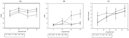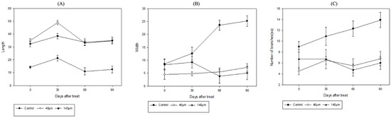 Lythrum anceps growth changes in an aquatic environment polluted with microplastics: (A) lengths, (B) widths, and (C) numbers of branches.