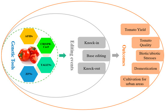 The recent developments in tomatoes as a result of genetic engineering technology. AFIDs: APOBEC-Cas9 fusion-induced deletion systems; CRISPR/Cas9: Clustered Regularly Interspaced Short Palindromic Repeats-associated Protein9; TALENs: Transcription Activator-like Effector Nucleases; and ZFNs: Zinc Finger Nucleases.