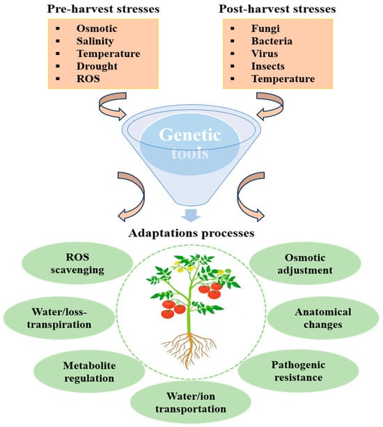 Pre- and post-harvest challenges present a significant obstacle in affecting the quality and yield of tomatoes. These challenges include susceptibility to pests, diseases, and environmental stressors, as well as issues related to storage, transportation, and shelf life [42]. Genetic engineering tools like CRISPR-Case9 offer promising solutions to alleviate these challenges. By precisely modifying the genes of crops, scientists can enhance traits such as pest resistance, disease tolerance, and post-harvest longevity [92]. For instance, through genetic engineering, tomatoes can be developed to have high firmness, improved resistance to common diseases, and prolonged shelf life. These genetic modifications not only improve the overall resilience of crops but also contribute to reducing pre- and post-harvest losses and ensuring a more sustainable and reliable food supply for communities worldwide [110]. The potential of genetic engineering to address pre- and post-harvest challenges highlights its importance in modern tomato farming and underscores its role in enhancing food security and agricultural sustainability. Figure 2 below shows various challenges in the pre- and post-harvest of tomatoes including biotic and abiotic stresses and their adaptations through genetic engineering.