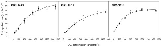 When comparing the photosynthetic rates by date, differences were observed in the maximum photosynthetic rates depending on the measurement date. The maximum photosynthetic rates (Amax) were 33.9 μmol·m−2·s−1 on 26 July, 27.5 μmol·m−2·s−1 on 14 August, and 29.3 μmol·m−2·s−1 on 14 December. However, considering the nature of photosynthetic measurements, which are strongly influenced by external environmental factors, such variations are expected. Nonetheless, the observed photosynthetic rates seem adequate when compared to previous studies [26,27].