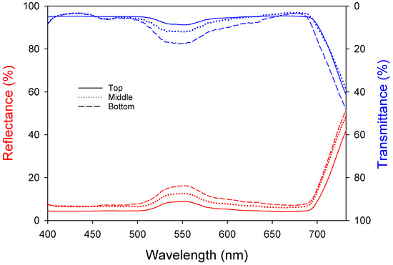 Light absorption by leaves is an important factor in photosynthesis. Leaves undergo emergence, cell division, and expansion and have the greatest photosynthetic ability when they are fully developed. However, the photosynthetic ability decreases with senescence and reduced light absorption. Both the reflectance and transmittance increased at approximately 550 nm (Figure 2), meaning that light in this band was reflected the most, which can be explained by the green color of the leaves. The top leaves show the highest photosynthetic activity due to the lowest reflectance (5.29 ± 0.04%) and transmittance (5.61 ± 0.07%). The middle leaves exhibit intermediate levels with reflectance (7.79 ± 0.05%) and transmittance (6.22 ± 0.15%). The bottom leaves, due to aging, have the highest reflectance (9.26 ± 0.08%) and transmittance (8.37 ± 0.26%), resulting in lower photosynthetic efficiency. Table 3 shows the reflectance, transmittance, and absorptance of each wavelength band. The upper leaves had high absorptance levels of approximately 90% at 400–500 nm and 600–700 nm and 86% at 500–600 nm. The absorptance decreased from the upper (89.10 ± 0.02%) to the middle (86.00 ± 0.05%) to the lower leaves (82.37 ± 0.09%); the leaf age and light absorptance were inversely proportional.