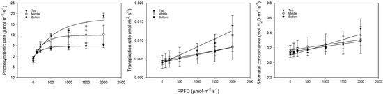 Comparison of bell pepper leaf photosynthetic rate, transpiration rate, and stomatal conductance according to leaf position and PPFD.