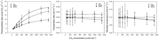 The photosynthesis curves, regression equations, and coefficients of determination for CO2 at each leaf position are shown in Figure 4 and Table 5. When CO2 was restricted, the photosynthetic rate showed a flatter slope with lower leaf positions, indicating that the differences grew larger with increasing concentrations. The photosynthetic rate was 23.0, 19.1, and 9.3 μmol CO2·m−2·s−1 for the upper, middle, and lower leaves, respectively. The transpiration and stomatal conductance showed similar trends, with the upper leaves exhibiting higher rates compared to the middle and lower leaves, likely due to better adaptation to higher light conditions. The middle and lower leaves showed a weaker response to increasing CO2, suggesting that these leaves were more shaded and less efficient in gas exchange.