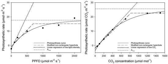 Using the photosynthesis curves above, we compared the bell pepper saturation point (Figure 5), and, using these two equations, we obtained the light and CO2 saturation points (Table 6). The dots in this figure represent measured values corresponding to changes in PPFD and CO2 concentration. The light saturation point was 438 μmol·m−2·s−1 according to the asymptotic exponential equation but 690 μmol·m−2·s−1 according to the modified non-rectangular hyperbola equation.