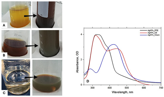 The successful creation of silver nanoparticles shown by the change in the color of (A) pomegranate peel extract (PPE), (B) coffee bean extract (CE), (C) trisodium citrate, and UV-vis sharp absorption spectra of AgNPs (D), respectively. Arrows indicate the color change.