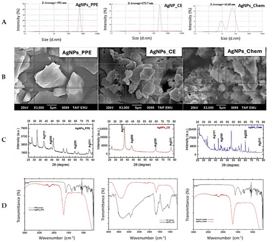 Zeta potential was used to estimate the stability of the produced AgNPs, where higher zeta potential values indicate more stable nanoparticles. A chemically produced AgNPs_Chem (46.7 mV) was found to be more stable than AgNP_CE (12.6 mV) and AgNPs_PPE (7.98 mV), which had the least stability. Figure 3A shows how a reduction in AgNPs stability causes particle aggregation, which leads to a size increase for AgNPs_PPE = 591.9 nm, AgNPs_CE = 273.7 nm, and AgNPs_Chem = 62.75 nm. This suggests that chemically synthesized AgNPs (AgNPs_Chem) were the most stable, followed by those from coffee extracts (AgNPs_CE), and lastly, those from pomegranate peel extracts (AgNPs_PPE).
